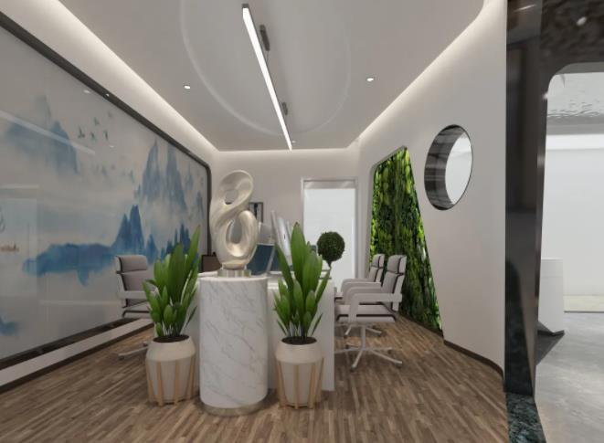 3、天花水波紋鏡面不銹鋼波光粼粼,倒影婆娑,中間點(diǎn)綴白色射燈,星光點(diǎn)點(diǎn),仿佛仰望銀河,體驗(yàn)區(qū)靠落地窗橢圓拱形網(wǎng)狀金屬鏤空材質(zhì),霧里看花,花更美,營(yíng)造朦朧隱約東方詩(shī)意之境,呼應(yīng)品茶洽談區(qū)中式嵌入式茶桌,讓顧客感受尊貴體驗(yàn)同時(shí)一覽江景,身心徹底放松達(dá)到物我兩忘之境。辦公樓產(chǎn)品展示區(qū)蜂窩背發(fā)光造型突出展品的高科技品質(zhì)感。辦公區(qū)裝飾設(shè)計(jì):山水玻璃隔斷與綠植墻共同營(yíng)造呼吸在山水綠意之間的意境,讓工作充滿(mǎn)詩(shī)意與生機(jī),通透圓形玻璃與前廳區(qū)連接,運(yùn)用借景設(shè)計(jì)手法,給空間帶來(lái)意趣。