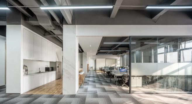2、協(xié)作與可持續(xù)理念相結(jié)合的開放式辦公室設(shè)計:天花設(shè)計富有特色,由白色穿孔金屬板彎折出具“通風”功能的裝飾吊頂。光澤的金屬質(zhì)感與粗獷的黑色原始建筑頂面形成強烈的視覺反差。新舊的對比、色彩的對比、質(zhì)感的對比、簡練的設(shè)計結(jié)合當下潮流靈動辦公理念,成功塑造出一個具專業(yè)氣質(zhì)的時尚辦公空間。